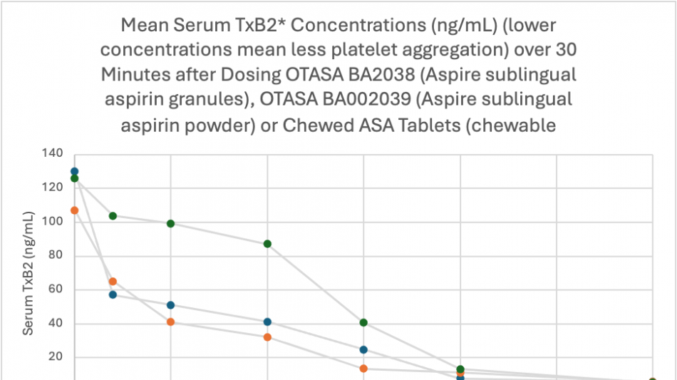 Aspire's OTASA BA2039 sublingual formulation also significantly inhibited serum thromboxane B2 (TxB2) within the first two minutes after dosing compared to the chewed oral aspirin tablets (p2 is a biomarker for the effect of aspirin on platelet aggregation. This has significant and important positive implications for its role in the inhibition of blood clotting and its role in heart attacks.