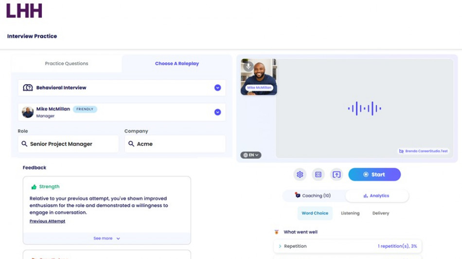 In the LHH Interview Center, an AI interviewer engages users in practical roleplay by asking contextual questions, responding dynamically and providing actionable commentary on delivery, content and communication style. This platform supports multiple interview formats where users can customize their practice to tailored questions based on job descriptions, to ensure preparation is both relevant and effective.