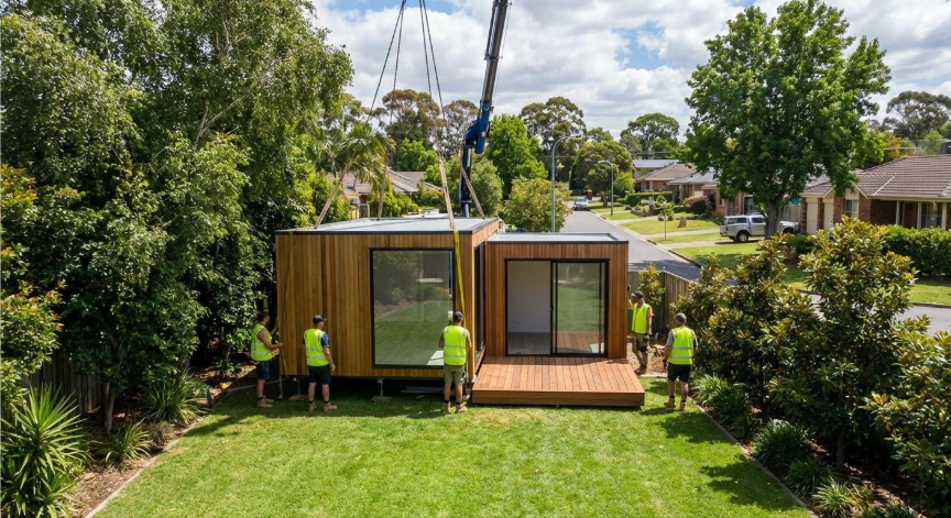A prefabricated garden suite under installation in a Canadian suburban backyard - a fast, cost-effective approach to expanding housing supply.