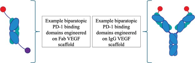 In the HS1940 family, the anti-PD-1 components leverage a novel design inspired by bovine antibodies, enabling them to target previously undruggable PD-1 epitopes. The anti-VEGF component, and the overall multispecific format, are engineered using EpiClick's modular design capabilities to create novel biparatopic PD-1 binding domains engineered on multiple VEGF scaffolds, as illustrated below.