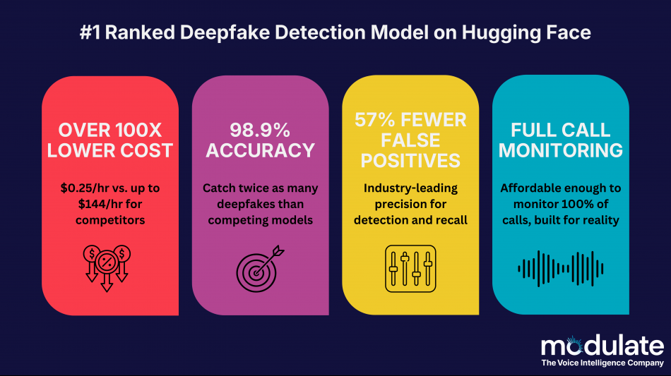 New Velma API from Modulate delivers best-in-class precision at over 100x lower cost, enabling full-call deepfake detection at production scale. Ranked #1 in accuracy by Hugging Face.