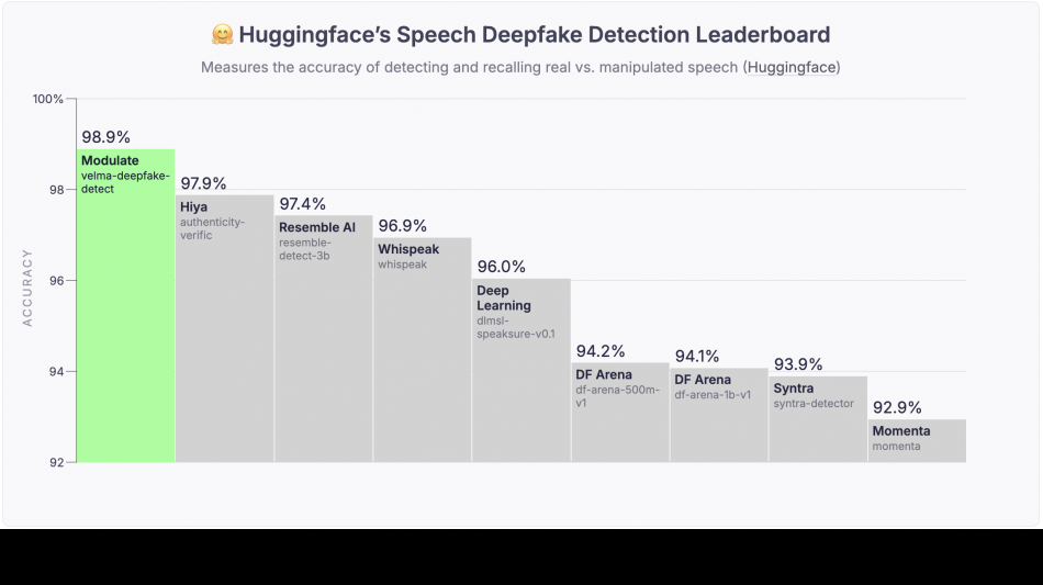 BOSTON, MA / ACCESS Newswire / March 31, 2026 / Modulate, the frontier conversational voice intelligence company, today announced the launch of Velma Deepfake Detect, a synthetic voice detection API that makes continuous, full-call monitoring economically viable at scale for the first time. Ranked #1 on the Hugging Face Deepfake Speech leaderboard, Velma Deepfake Detect combines state-of-the-art accuracy with 578x lower cost vs. the next-best model, enabling detection of AI-generated audio across entire conversations in both batch and real-time streaming environments.