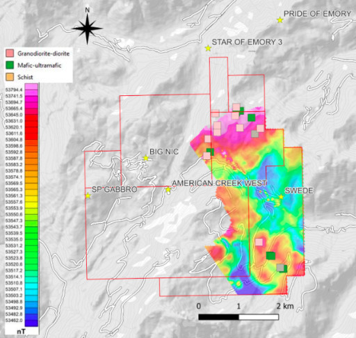 Figure 1: Map showing total magnetic intensity for the 2024 UAV magnetic survey, 2024 rock sampling locations classified by lithology, and showings of Ni-Cu sulphide and/or ultramafic rock (yellow stars). The green squares indicate rock samples that were described and have geochemical characteristics consistent with gabbroic to ultramafic rocks, which are the host rocks for the Star of Emory and Pride of Emory Ni-Cu sulphide deposits located just north of the property.