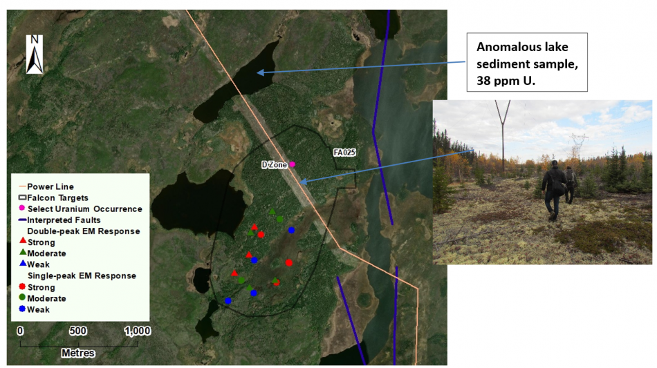 To date, North Shore has identified 36 uranium targets at Falcon with nine of these being in Zone 3 (Figure 1). Most of Zone 3 consists of four claims that are 100%-owned by the Company. The targets are associated with electromagnetic ("EM") conductor anomalies and have been selected based on the analysis of multiple datasets utilizing interpretation by Condor North Consulting LLC ("Condor"), Earthfield Technologies Inc.("Earthfield"), and North Shore. There are three documented uranium occurrences in Zone 3, the D Zone showing (Target FA025), the Big Sandy Boulder Fan and the Geike River Boulder Fan (Sakatchewan SMDI 2455, 2020 and 2456 respectively)(Figure 1). At the D Zone, one sample from a mineralized vein returned 1.26% uranium ("U") and 0.8% molybdenum ("Mo"). Located approximately six kilometres southwest of the D Zone and discovered in 1980, the Geike River Boulder Fan is a 500 m long, 30 to 100 m wide fan consisting of 19 boulders that are 30 to 200 cm diameter. One boulder returned 0.969% U, 215 ppm copper ("Cu") and 472 ppm Mo, another 0.531% U, 1380 ppm Cu and 2,120 ppm Mo. The Big Sandy radioactive boulder field consists of 37 boulders along a 2 km trend, samples from three boulders averaged 1520 ppm U, 425 ppm thorium and 8,670 ppm Mo. In 1980, three holes were drilled by AGIP Canada Ltd. ("AGIP") associated with the D Zone. Also in 1980, AGIP drilled nine shallow holes totaling 810 m approx. one kilometre northeast of the Big Sandy boulder field. One radioactive interval between 18 and 22 m in one of the nine holes returned a maximum of 87 ppm U. Examples of three target areas that are being considered for future work in Zone 3 are FA025, FA029/FA024 and FA026 (Figure 1).
