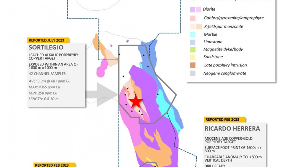 Detailed mapping at Sortilegio has demonstrated a leached alkalic porphyry style copper mineralization over an area of 1,800 m by 1,000 m area. Most notable is a stockwork of goethite veinlets overprinting all phaneritic rocks with six core zones with >20 veinlets/m. Lower intensity veining, marked by 10 to 20 veinlets/m envelope the core zone and form a halo to the higher-grade mineralization. High-grade copper-gold bearing massive goethite boulders with remnants of secondary biotite with one boulder assaying 16.0% Cu and 4.4 g/t Au are interpreted to be sourced from structurally controlled mineralization within these core zones.