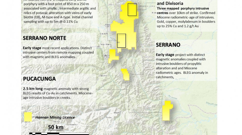 At the Valiente project, Hannan is targeting Miocene age porphyry copper-gold in a back-arc setting in Central Eastern Peru. Hannan considers the belt to be a potential new metallogenic province of Peru. Located far inboard of the conventional porphyry settings, the project shows regional similarities to deposits such as the large Bajo de Alumbrera copper-gold porphyry in Argentina.
