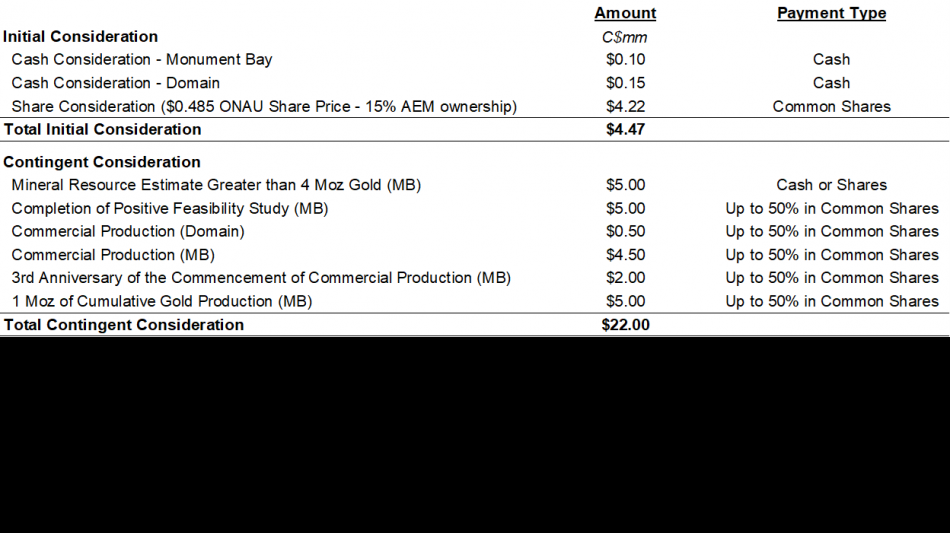 ONGold will acquire the Projects for an Initial Consideration of approximately $4.5 million, consisting of $250,000 in cash and 8.7 million ONGold common shares valued at approximately $4.2 million at a $0.485 ONAU share price, with $150,000 of the cash consideration paid under the Domain Agreement and the balance of the Initial Consideration of $100,000 and 8.7 million ONGold common shares paid under the MB Agreement. In addition, Agnico Eagle will be entitled to up to $21.5 million in contingent milestone-based payments under the MB Agreement while Agnico Eagle and Capella will together be entitled to $0.5 million in contingent milestone-based payments under the Domain Agreement.