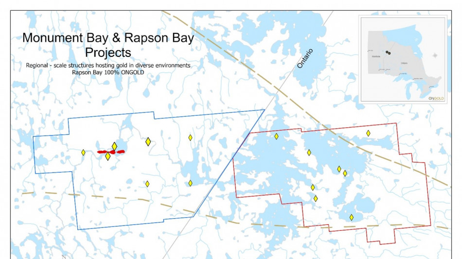 The Monument Bay Property is contiguous to ONGold's Rapson Bay Project in Ontario, which consists of 1,528 cell units covering over 286 km2. This property covers approximately 23 km of the Wolf Bay Shear Zone, a splay from the regional Stull-Wunnummin Fault Zone ("SWFZ"). This shear separates the basalt-dominated Hayes River Group and Oxford Lake Group, which consists mainly of intermediate to felsic volcanics and derived sedimentary rocks. The Gilleran Lake Intrusive is a differentiated mafic intrusion within the Hayes River Group. Several gold, copper and zinc showings are known on the property. Rapson Bay is located approximately 30 km from the camp at Monument Bay, allowing ONGold to utilize the existing camp infrastructure to conduct and expand exploration activities at Rapson Bay.