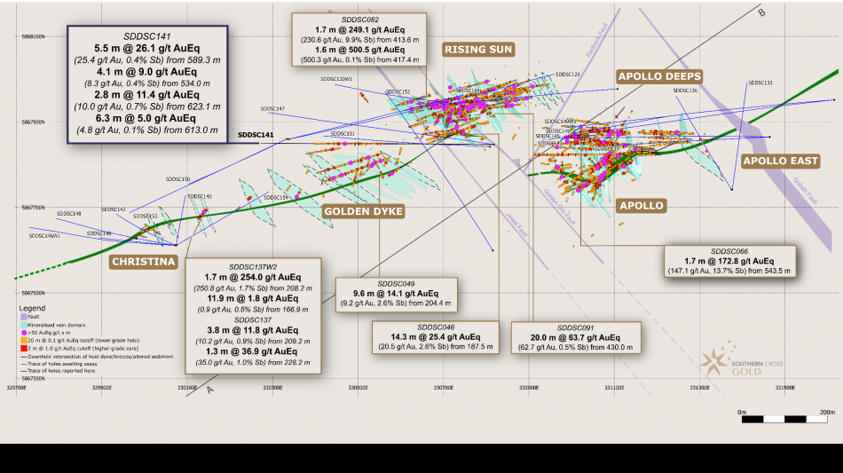 Figure 2 : Sunday Creek longitudinal section across A-B in the plane of the dyke breccia/altered sediment host looking towards the north (striking 236 degrees) showing mineralised veins sets. Showing hole SDDSC141 reported here (blue highlighted box, black trace), with selected intersections and prior reported drill holes. The vertical extents of the vein sets are limited by proximity to drill hole pierce points. For location refer to Figure 1.