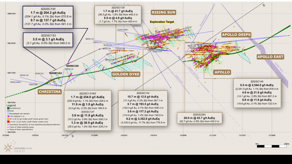 "The project footprint now spans 1,350m strike from Christina to Apollo prospects, with only approximately 620 m has been more intensively drill tested. We've defined at least 70 'rungs' to date, characterized by high-grade intercepts (between 20 g/t to >7,330 g/t Au) and now have a total of fifty-five (55) >100 g/t AuEq x m intersections. Most importantly, the consistency in grade distribution, structural characteristics, and host rock properties remains predictable at depth.