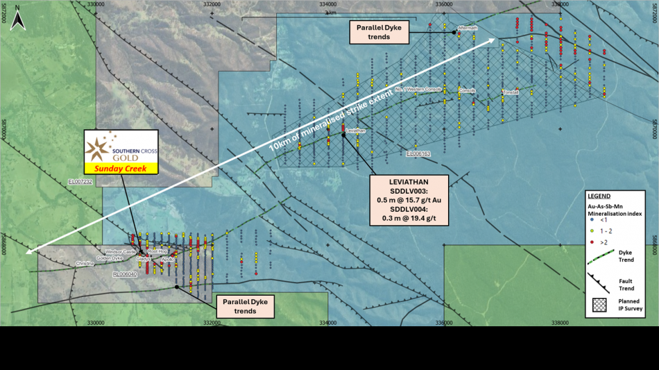 Southern Cross Gold Consolidated Ltd. (TSXV:SXGC, ASX:SX2) controls the Sunday Creek Gold-Antimony Project located 60 kilometres north of Melbourne, Australia. Sunday Creek has emerged as one of the Western world's most significant gold and antimony discoveries, with exceptional drilling results including 55 intersections exceeding 100 g/t AuEq x m from just 70.7 km of drilling. The mineralization follows a "Golden Ladder" structure over 12 km of strike length, with confirmed continuity from surface to 1,100 m depth.