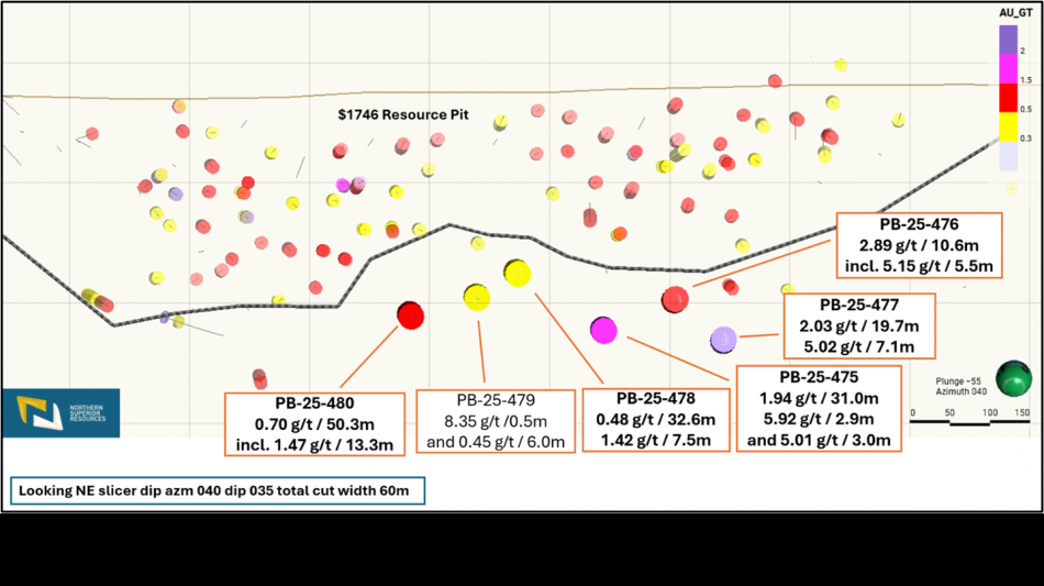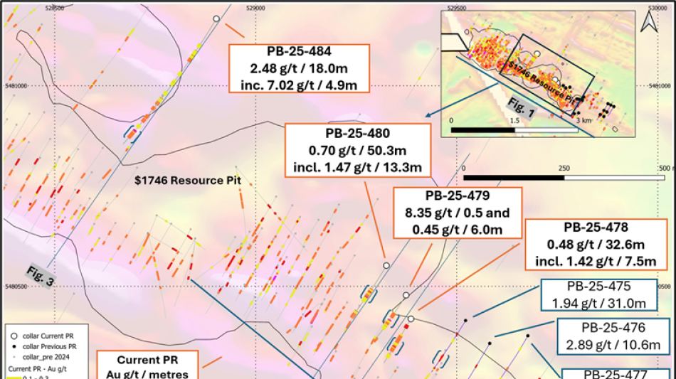 PB-25-480, drilled 80 metres west of PB-25-479, intersected 0.70 g/t Au over 50.3 metres, including 1.47 g/t Au over 13.3 metres, at a vertical depth of 160 metres, approximately 100 metres below the resource pit in an area where the pit shallows to surface (see Table 1 and Figures 1, 2, 4 and 5).