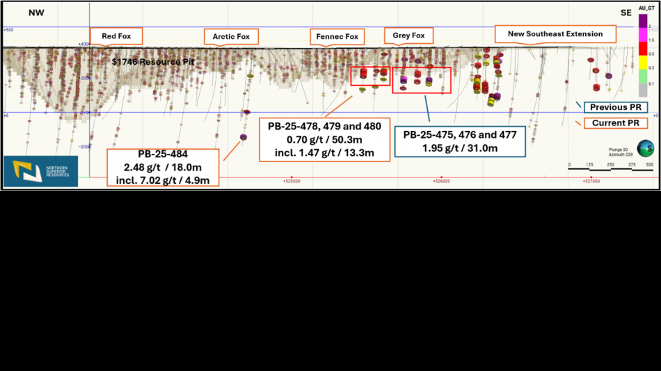 "We're particularly excited by hole PB-25-484, which delivered both significant grade and width, demonstrating the strong potential to add high-quality ounces to our overall resource base. This intercept confirms that mineralization continues down-dip and becomes enriched at vertical depths exceeding 500 metres, providing compelling targets for continued expansion. In addition, we intersected significant mineralization across a 150-metre strike length in an area that had seen limited historical drilling. Situated between the Fennec Fox and Grey Fox zones, these new intercepts-together with previously reported results-highlight the potential to define a continuous, 400-metre mineralized corridor underneath the current pit shell, where its geometry remains shallow compared to the depth of the Red Fox Zone (See Figure 1)," added Adree DeLazzer, Vice President of Exploration.