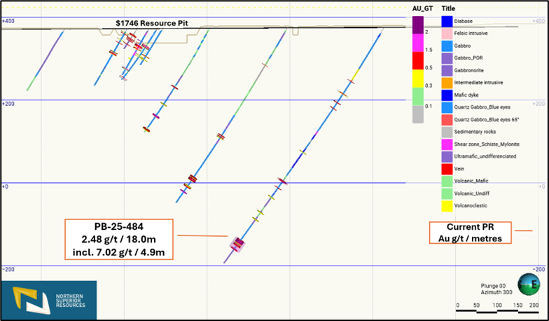 New Zone Discovered Beneath and South of Current Resource: PB-25-484: 2.48 g/t Au over 18.0 metres (620.0 m to 638.0 m), including 7.02 g/t Au over 4.9 metres (621.1 m to 626.0 m);