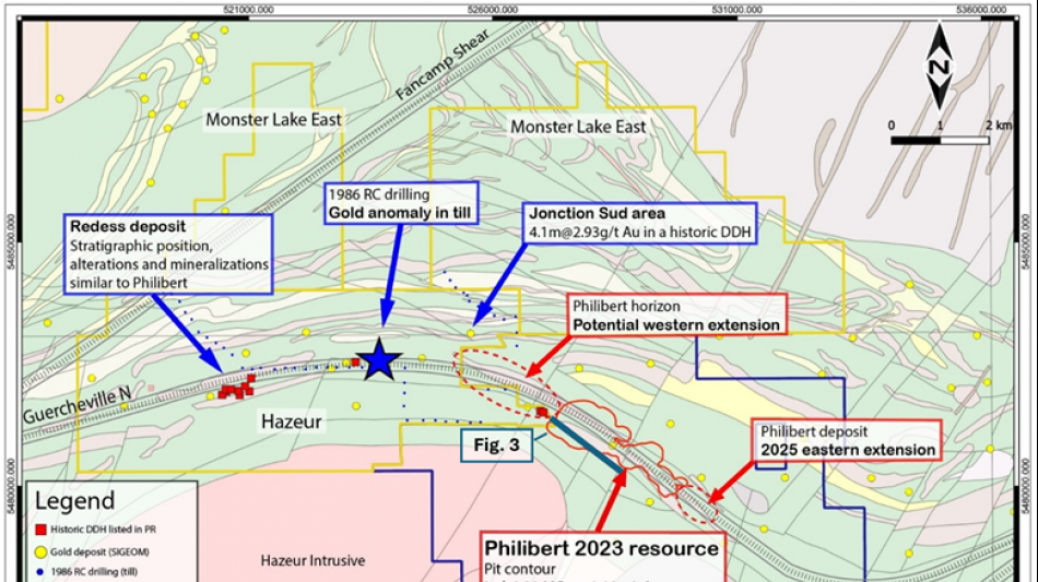 "In addition to the Hazeur property, the acquisition of the Monster Lake East and West properties gives us control over highly prospective ground along the Fancamp trend, adjacent to our Chevrier Project and IAMGOLD's Monster Lake Project. We're very encouraged by the strategic potential these new land packages offer. This acquisition extends our control to over 15 kilometres along the Guercheville Fault Zone ( see Figure 2 ), where the Philibert deposit remains open in both directions. The Hazeur property shows strong evidence for the continuation of Philibert-style mineralization. Additionally, we now cover more than 30 kilometres along the highly prospective Fancamp Fault Zone and Monster Lake trends, where we plan to apply our evolving geological and structural models to identify and advance new discovery targets," added Adree DeLazzer, Vice President of Exploration.