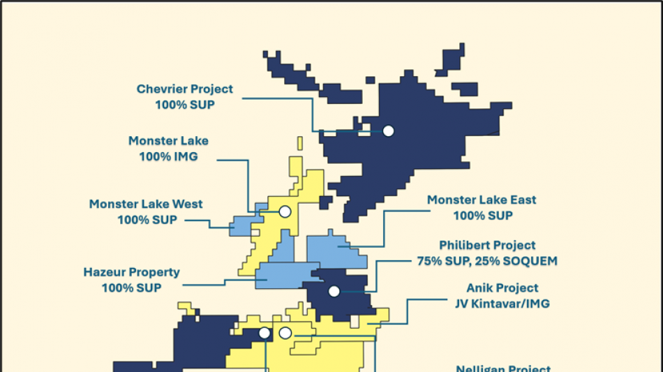 The Company believes the Hazeur property could be the northwest extension of its flagship Philibert Project (Northern Superior: 75%, SOQUEM: 25%), located just 9 km from IAMGOLD Corporation's (" IAMGOLD ") Nelligan project and 60 km southwest of Chibougamau, Quebec. Furthermore, the Monster Lake East and Monster Lake West properties are located on either side of IAMGOLD's Monster Lake property, and between the Company's Philibert and Chevrier projects (see Figure 1, 2 and 3 below).