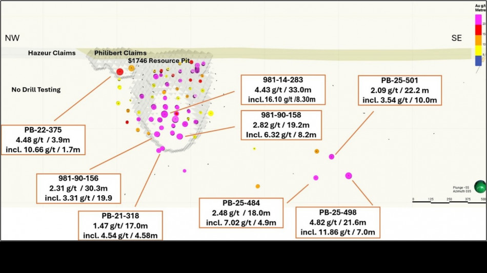 The Company sees potential to expand the Philibert deposit along strike to the west, particularly within multiple shear zones such as the Red Fox Zone, which historically has seen the most drilling. The western limit of the Philibert deposit remains open, highlighted by near-surface intercepts of 4.84 g/t Au over 3.9 metres, including 16.4 g/t Au over 0.8 metres in hole PB-22-375. These results suggest the presence of a high-grade plunge within the gold system, which the Company is actively investigating ( see Figure 2 ).