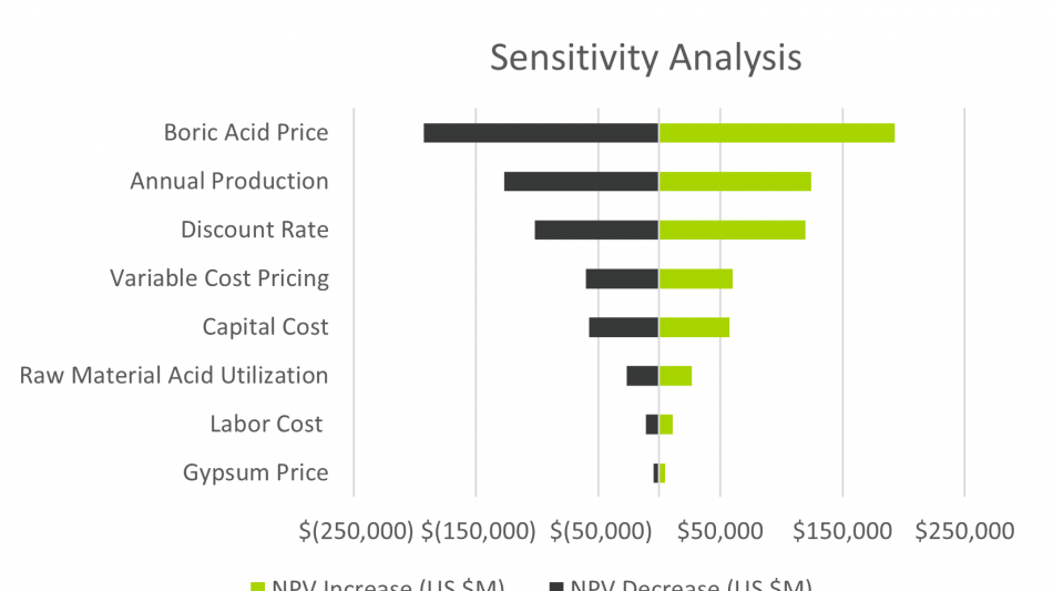 Sensitivity analysis for the financial model was performed based on changes to boric acid price, annual production, discount rate, variable cost pricing, gypsum price, labor cost per person, and raw material acid utilization. Using a ±10% change for each variable, NPV7 is plotted in real dollars for comparison and arranged in order of total variability.
