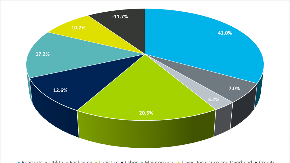 Operating costs for the project are segregated into Variable, Fixed, and Other operating costs and are based on detailed material and energy balances provided by Fluor Corporation and a principles first labor build-up. Variable operating costs include packaging, logistics, and raw materials such as natural gas, hydrochloric acid, sulfuric acid, and lime. Fixed operating costs include administrative labor, operating labor, general and administrative overhead, repair labor, repair materials, as well as taxes and insurance. Other operating costs include disposal costs of metals impurities offset with byproduct credits from gypsum and calcium chloride. Table 5 summarizes the operating cost by production phase.