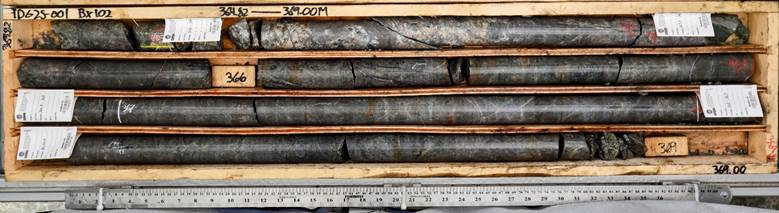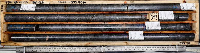 TDG25-001 intersected 100.0 m grading 2.24 grams per tonne ("g/t") gold ("Au") and 0.38 % copper ("Cu") from 308.0 m depth, contained within a broader 240.6 m zone grading 1.23 g/t Au and 0.23 % Cu (Table 1 for drill results summary; Figures 1a-c for Core Images).