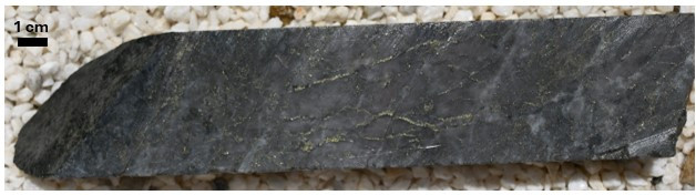 The geological and hydrothermal characteristics of AuWEST discovery hole TDG25-001 are broadly consistent with generalized models for porphyry Cu-Au-Ag deposits in the Toodoggone. Mineralization is hosted by altered andesitic tuff. High grade mineralization has an association with magnetite alteration and with a younger, overprinting, pervasive quartz-sericite/chlorite-pyrite alteration. Copper mineralization is mainly stockwork-style chalcopyrite (Figure 1a), and precious metal mineralization has not yet been visually identified (too fine grained). The IP signature appears to be related to disseminated sulphides that overlie Cu-Au mineralization. The style of mineralization in TDG25-001 is broadly similar in appearance to that encountered in subsequent drillholes in the AuWEST target area (Figures 1b-c).