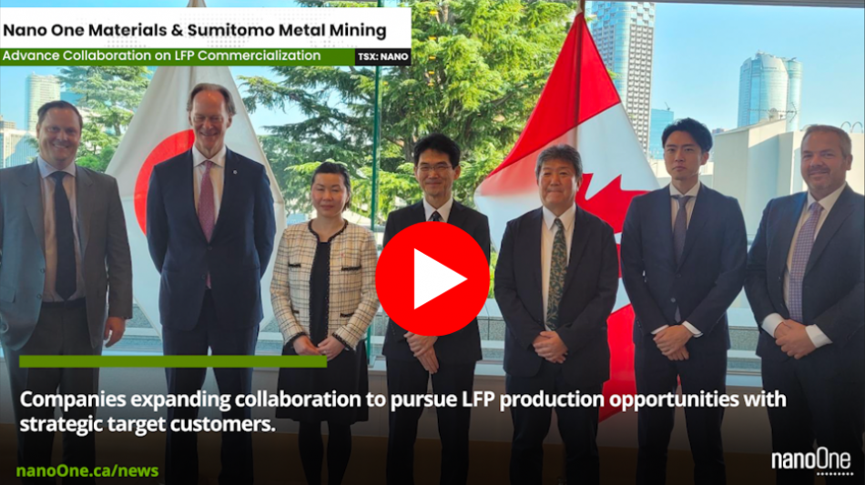 Mr. Alex Holmes, COO of Nano One said, "Current market dynamics amplify the strategic value of our technology in enabling the economic localization of cathode materials supply chains. The combined experience and collaboration between Sumitomo Metal Mining and Nano One over the past two years has led us to this significant milestone in our partnership. We continue to execute successfully on our joint objectives, and we are confident our partnership will lead to future commercial production opportunities that will accelerate the adoption of LFP and global supply chain security."