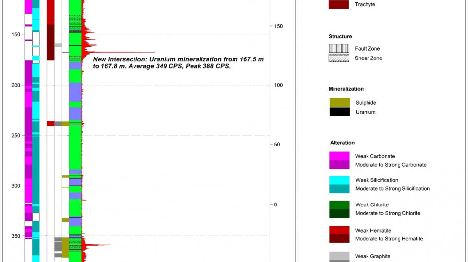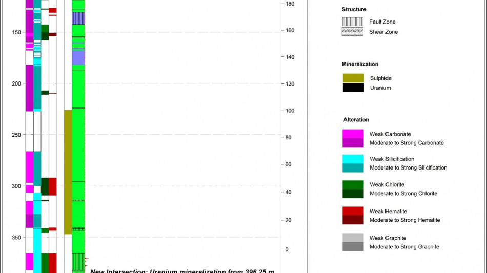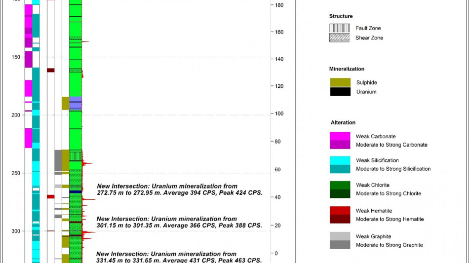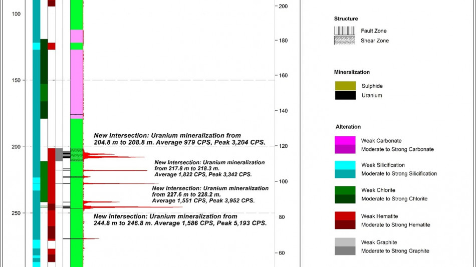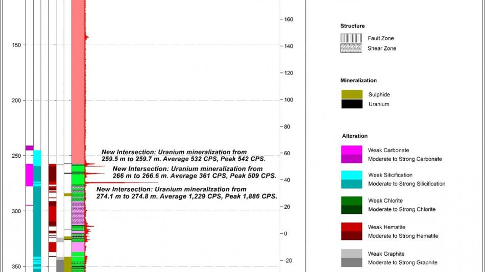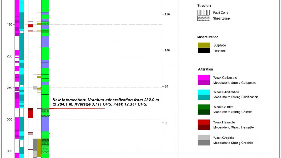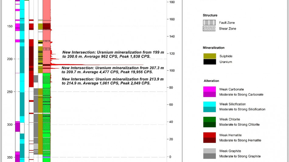 The Company has completed two maiden drill holes at the RIB West Discovery resulting in the third new discovery of its 2025 drill program. RIB_W-DD-001 targeted a gravity and EM anomaly located ~1.5 km to the west of the RIB East Discovery. The hole intersected 2.1 m of composite mineralization, including 0.5 m of high-grade uranium mineralization with a peak response of 18,485 CPS 1 . The second hole at RIB West, RIB_W-DD-002, drilled approximately 340 m along strike to the north-east of RIB_W-DD-001, successfully intersected 8.5 m of composite mineralization over a broad interval, between 204.8 m and 269.5 m, hosted with a broad graphitic structure. Drilling at RIB West has demonstrated uranium mineralization potential continuity over a 340 m strike length; the majority of the prospective RIB West trend remains untested by drilling.