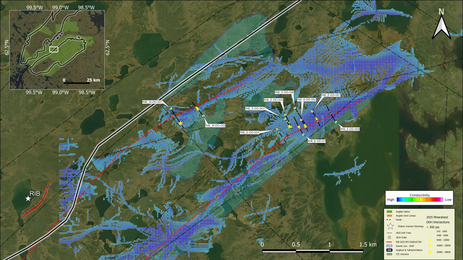 Cliff Revering, VP Exploration added: " We are very excited about the results emerging from the RIB regional target area, including another discovery along the RIB West trend and the continued expansion of the mineralized strike length along the RIB East trend. To date, we have drill-tested only a relatively small proportion of the prospective trends within the RIB area, with all completed holes intersecting uranium mineralization associated with graphitic structural corridors. All prospective trends remain open along strike and at depth. We are also very encouraged by the accuracy of the EM inversion model provided by Expert Geophysics in locating graphitic structural corridors associated with uranium mineralization. This model has been highly valuable in guiding our targeting strategy in the RIB area, and in highlighting numerous additional prospective trends that have yet to be drill-tested. "