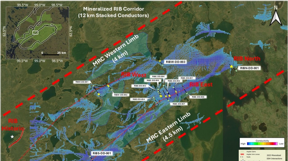 The MRC is now defined by over 12 km of stacked conductors based on the EM Inversion Model (Figure 2). The eastern limb of the MRC now has mineralization traced over a potential 4.4 km strike length, extending from RIB South, across RIB East to RIB North. Mineralization along the parallel, western limb of the MRC, extends from the Historic RIB Discovery through to the RIB West Discovery, tracing mineralization over a potential 4.0 km strike length. Outside of the currently defined discoveries, the MRC remains open and prospective for additional discoveries across the entire 12 km MRC.