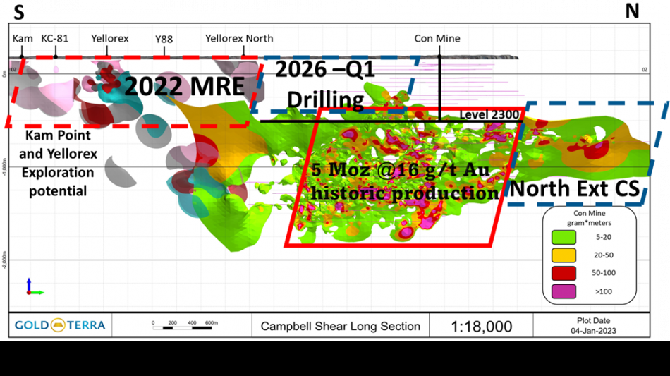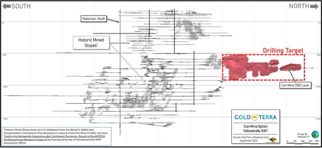 VANCOUVER, BC / ACCESS Newswire / September 26, 2025 / Gold Terra Resource Corp. (TSXV:YGT)(Frankfurt:TX0)(OTCQX:YGTFF) ("Gold Terra" or the "Company") has completed its review of the Con Mine 2002 historical resources of 650,000 ounces of gold at between 11-12 g/t dated January 1st 2003 (see Note 1 further in this news release). Based on the review, selected priority targets have been established for the upcoming drilling program scheduled to start before year end 2025 that will focus on the past producing Campbell Shear ("CS") structure. The goal of this drilling program is to confirm portions of the historical resources and investigate additional potential resources at lower cut-off grades, reflecting the current higher gold prices of today. This confirmation drilling could contribute to further increases to the current resource base of the Company prior to proceeding with economic studies.