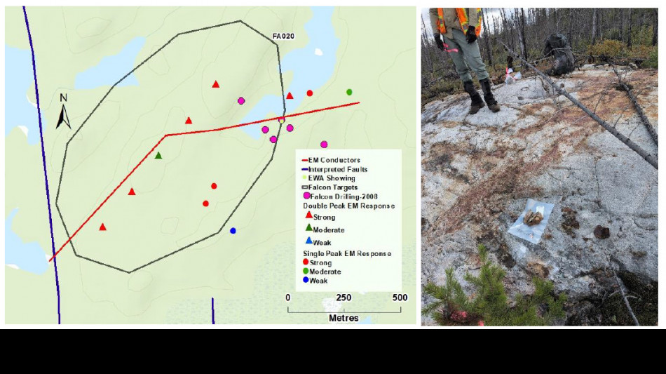 Target FA019, which is located at the eastern edge of the Property, is a 700 m long, strong EM conductor that is parallel to, and one km south of the main EM conductor trend at Falcon (Figures 1 and 5). The conductor is terminated at its western end by an interpreted prominent north-south-trending fault zone. The prospecting crew found one radioactive boulder that registered close to 7,000 cps on the scintillometer at this location. The granitic gneiss boulder had a 10 cm wide quartz vein with a mica-rich contact that displayed hematite alteration. The interpreted trace of the conductor roughly corresponds with an east-west-trending boulder train within a stream drainage.