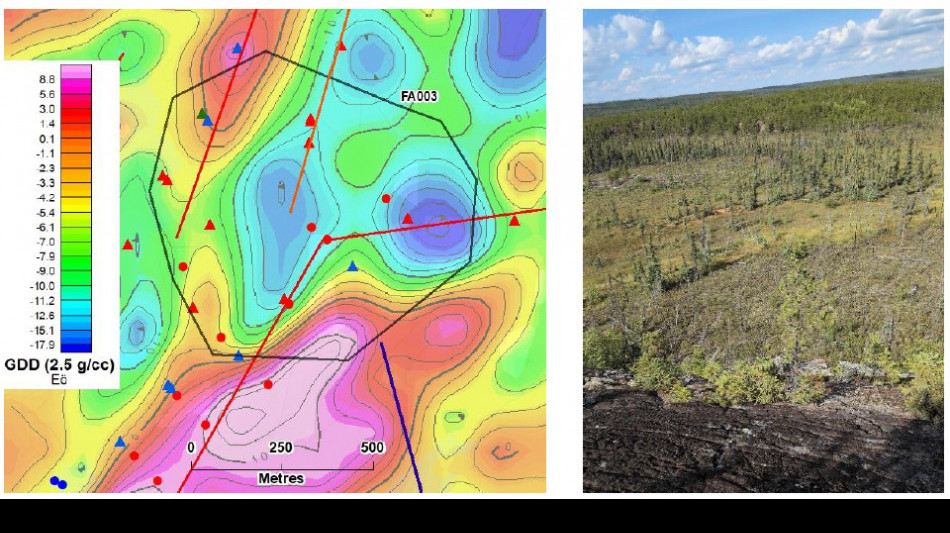 Target FA003 is at the south end of the potential mineralized trend defined by P03 and P08. At FA003, the EM conductor system and an associated magnetic low are disrupted and the system splits, with one arm going to the northeast, the other to the north. In addition, there is a gravity low anomaly which can be an expression of alteration that could be associated with uranium mineralization (Figure 3). The prospecting crew determined that most of the traces of the interpreted EM conductors are covered by muskeg. At the south end of the target zone, weakly radioactive pegmatitic and granitic boulders are present and are associated with an airborne radiometric uranium anomaly.