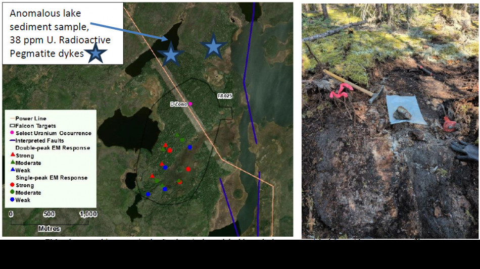 Approximately two km south of FA003 target FA002 is defined by two strong parallel EM conductors and a parallel magnetic low trend, and it is intersected by an interpreted northwest-trending fault. The conductor/fault intersections are under a lake, but a hill just southeast of the target showed a strong uranium anomaly defined by the 2022 airborne radiometric survey. The crew found several mica-rich stringers of radioactive pegmatite in outcrop in this area.