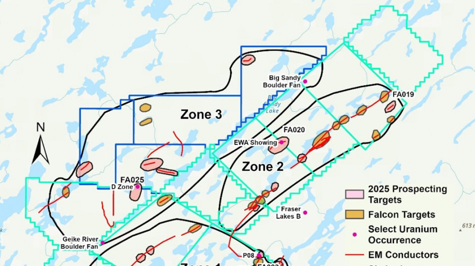Three priority areas have been established at Falcon, Zones 1, 2 and 3. Within these three areas, 36 uranium targets have been identified (Figure 1). The targets are associated with EM conductor anomalies and have been selected based on the analysis and interpretation of multiple geophysical and geologic datasets.