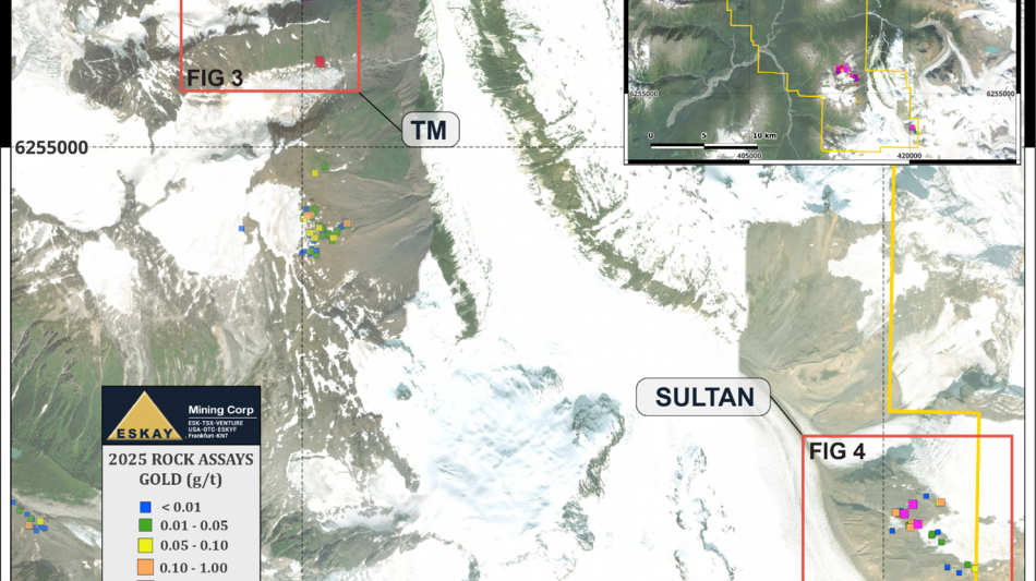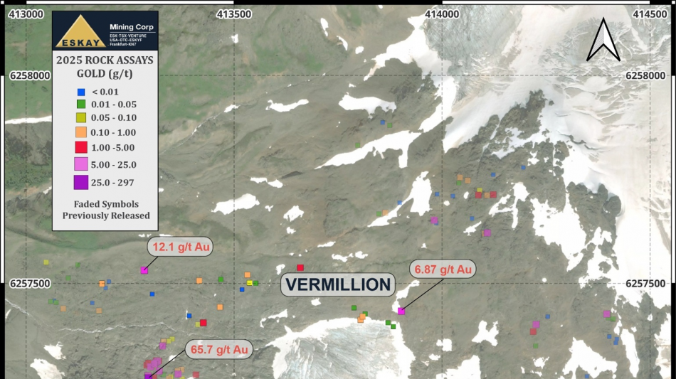 TORONTO, ON / ACCESS Newswire / November 7, 2025 / Eskay Mining Corp. ("Eskay" or the "Company") (TSXV:ESK)(OTC PINK:ESKYF)(Frankfurt:KN7)(WKN:A0YDPM) is pleased to provide additional assay results from its prospecting and sampling program at its 100% controlled Consolidated Eskay Project ("CEP") in the Golden Triangle, British Columbia. Over the summer months of 2025, the Company's geological team systematically prospected and sampled the Vermillion, TM, Red Lightning, and Big Red zones surrounding Unuk Finger Mountain in the southern extent of CEP where high grade gold veins were initially discovered in 2024.