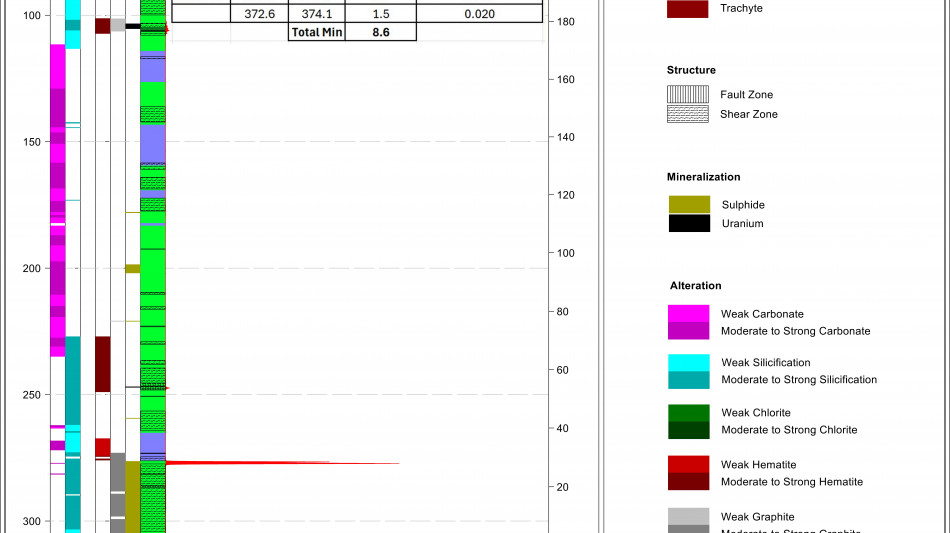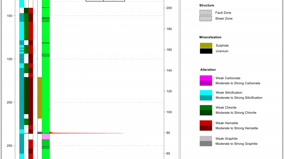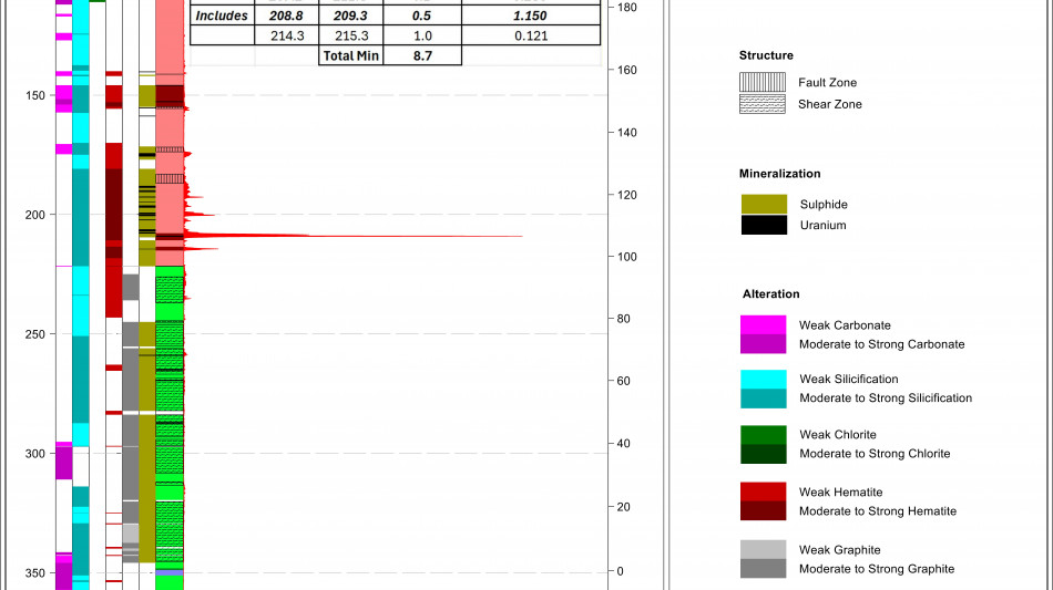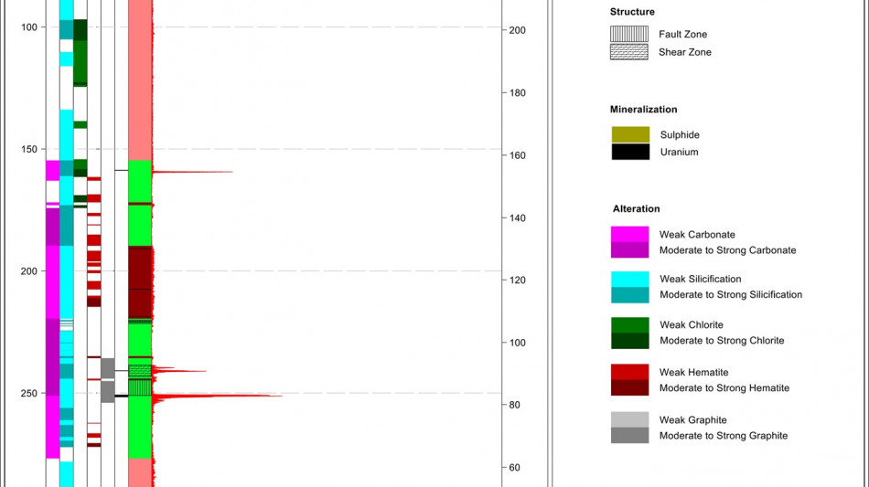 RIBS-DD-001 assays returned total composite uranium mineralization1 of 2.0 m encompassing two zones from 158.5 m to 252.1 m (Figure 8), including 1.5 m from 250.6 m to 252.1 m with an average grade of 0.11% U3O8;