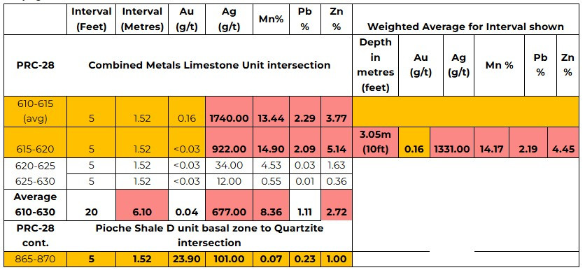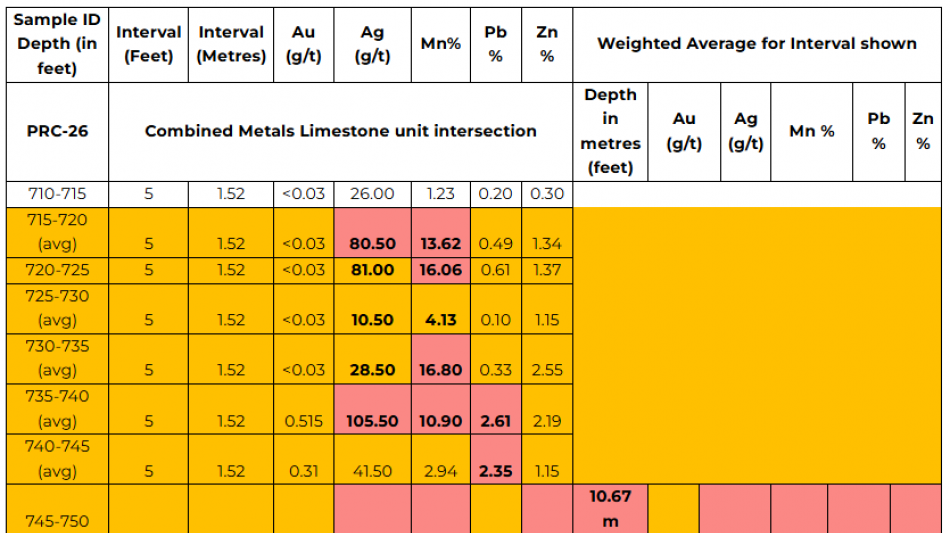 35 feet (10.7 metres) at 59.7 g/t Silver (Ag), 0.12 g/t Gold (Au), 10.97% Manganese (Mn), 1.04% Lead (Pb), and 2.07% Zinc (Zn).