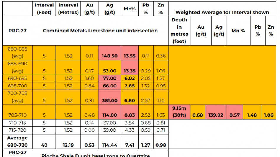 30 feet (9.15 metres) at 139.92 g/t Ag, 0.68 g/t Au,8.57% Mn, 1.48% Pb, and 1.06% Zn; and