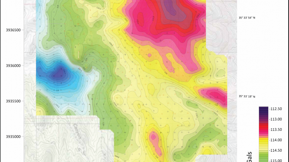 Figure 2: Preliminary Bouguer Gravity from the recently completed survey at Colosseum. The red and pink zones indicate higher density rocks, whilst the green and blues indicate lower density rocks (such as sediments). The strong gravity high on the eastern side points to dense intrusive or altered bodies at depth (alkaline intrusive rocks, breccia pipe roots, or carbonatite related material). There also appears to be a sharp N-S gravity gradient that aligns with the Clark Mountain fault.
