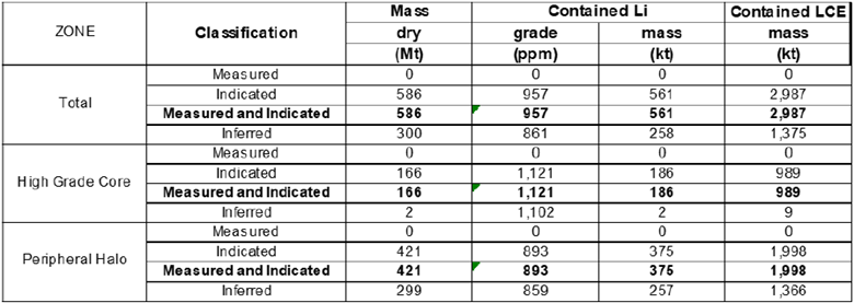 The SRK study reported a significant lithium clay deposit with a high-grade core and peripheral halo as stated in Table 1. The MRE was based on a lithium carbonate price of US$24,000 per tonne.