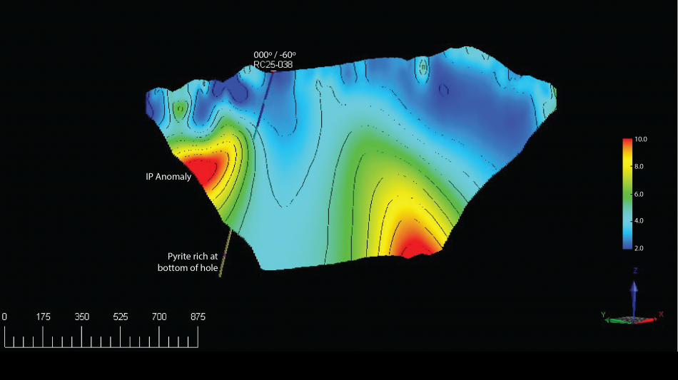 Figure 5: REE drill hole RC25-038 in relation to IP chargeability anomaly. The hole was drilled true north and just grazed the edge of Target 1. There were pyrite rich zones at the bottom of hole, proximal to Target 1.