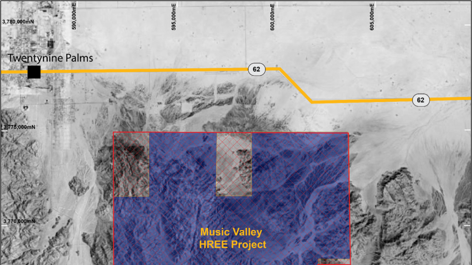 In March 2026, Dateline consolidated the Music Valley Heavy Rare Earth Project in Riverside and San Bernardino Counties, California. The region has known HREE mineralization from USGS rock chip sampling, however it has not been subjected to modern exploration techniques.