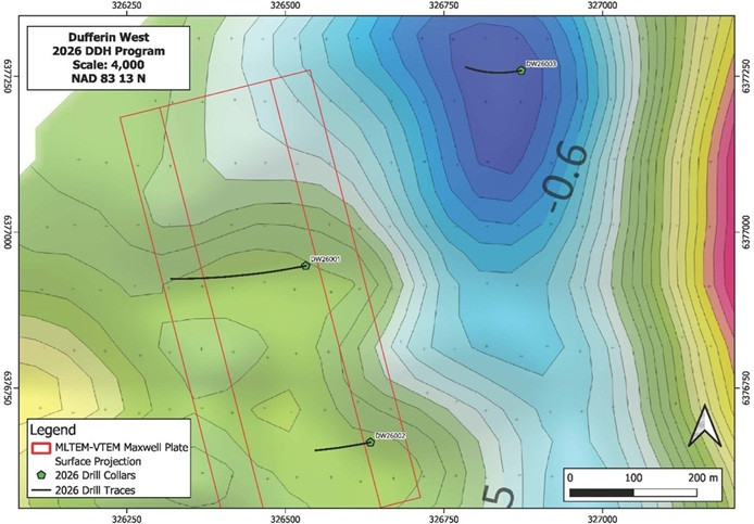 The drill program was designed to test multiple high-priority geophysical and structural targets across the Dufferin West property, integrating EM conductors, gravity lows, and magnetic features (see Figure 1).