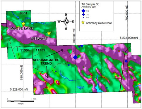 Figure 2 Antimony Showings, Till Anomalies, Aeromagnetic Anomalies