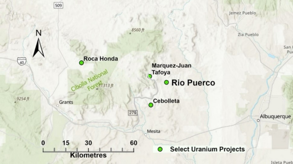 Figure 2. Rio Puerco Location Map, New Mexico. Roca Honda (Energy Fuels Inc.), Marquez-Juan Tafoya (Anfield Energy Inc.) and Cebolleta (Premier American Uranium Inc.) are advanced exploration/development stage uranium projects.